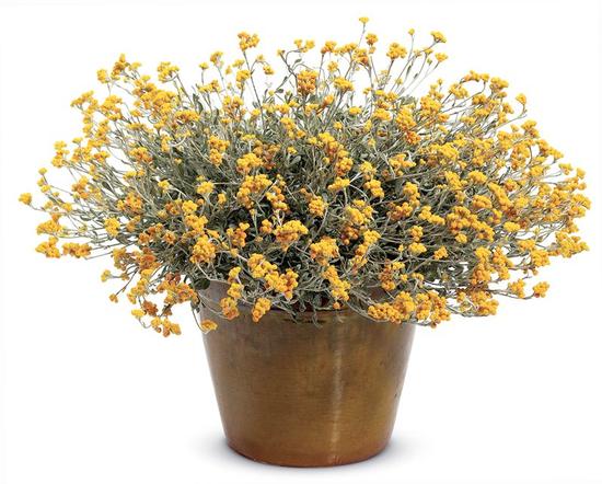 Chrysocephalum? I bet you looked at that name and said the same thing I did the first time I saw it – “I’ve never heard of this plant before.” The hard-to-pronounce name is Latin for “golden-headed,” in reference to the flowers. I was first introduced to “Flambe” chrysocephalum a few years ago, when it was entered into my trial program with promises of constant flowering and heat tolerance. I wasn’t terribly impressed with the plant at first glance. And as usual, I was skeptical of its claims, but it was native to southern Australia, which definitely is hot and dry.