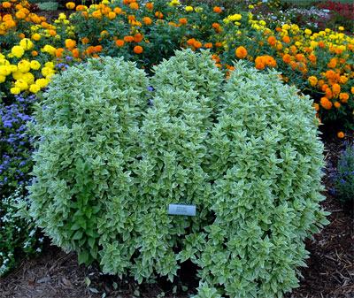 Basil ‘Boxwood’ is aptly named. It’s a basil plant that looks like a perfectly trimmed boxwood plant. This petite variety will quickly form 12- to 16-inch perfect globes of bright green foliage. It tastes and smells just like large-leafed Italian sweet basil, but its leaf is no bigger than the nail on your pinky. I love this variety planted solo in terra cotta pots, or used to make a faux parterre in the summer border. Last year I saw a wonderful planting of a bed of nothing but basils. Large-leaved ‘Geneva’ was encircled by ‘Pesto Perpetuo’ and then bordered with a perfect row of ‘Boxwood’ basils.