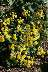 One plant I have been familiar with for quite awhile is leopard plant, a spotted form of this particular genus. Personally, I like the polka dotted foliage, but some gardeners think it just looks sick. So I was pleased to run across ‘Jitsuko’s Star’ three years ago while perusing the Plant Delights catalog (www.plantdelights.com). This variety has shiny green leaves, loves light shade, and in late fall sends up a fountain of 2" golden-yellow, double-star-shaped blossoms. The flowers start in early October and last through our first light frosts. The one in my trial garden is in absolute full bloom right now! After a hard freeze the foliage will die to the ground until early spring.