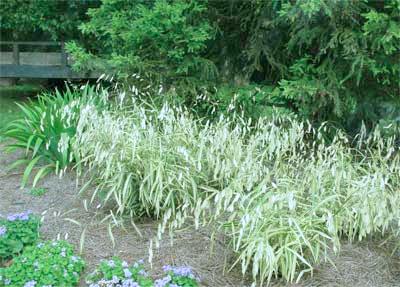 The arching plants will reach 3 feet tall and wide with seed heads, and can tolerate dry shade. I love it planted in masses, spotted into other groundcovers, or even taking center stage in shady containers. This variety does reseed, but the seedlings are solid green. I recommend removing them to prevent the vigorous solid green ones from taking the planting over.
