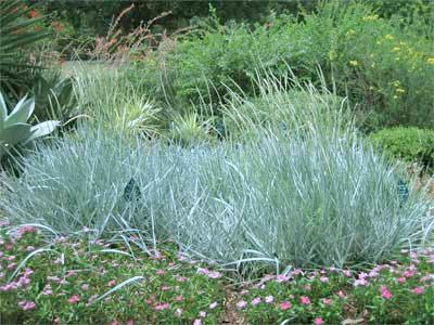 We have a new favorite grass from the Dallas Arboretum Plant Trials — Elymus arenarius glaucus ‘Blue Dune’. This striking grass has silvery blue foliage that shimmers in full sun and withstands the worst of Texas weather.